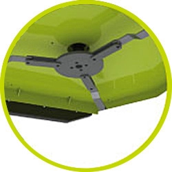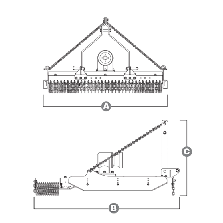 A talajkövetést és vágási magasságot a három pozícióban rögzíthető 8 mm anyagvastagságú csúszótalp és láncos függesztés biztosítja. A fűnyíró alváz 5 mm vastag acéllemezből készült. Függesztése a traktorra II-es kategóriás szabványos 3-pont csatlakozással történik.
