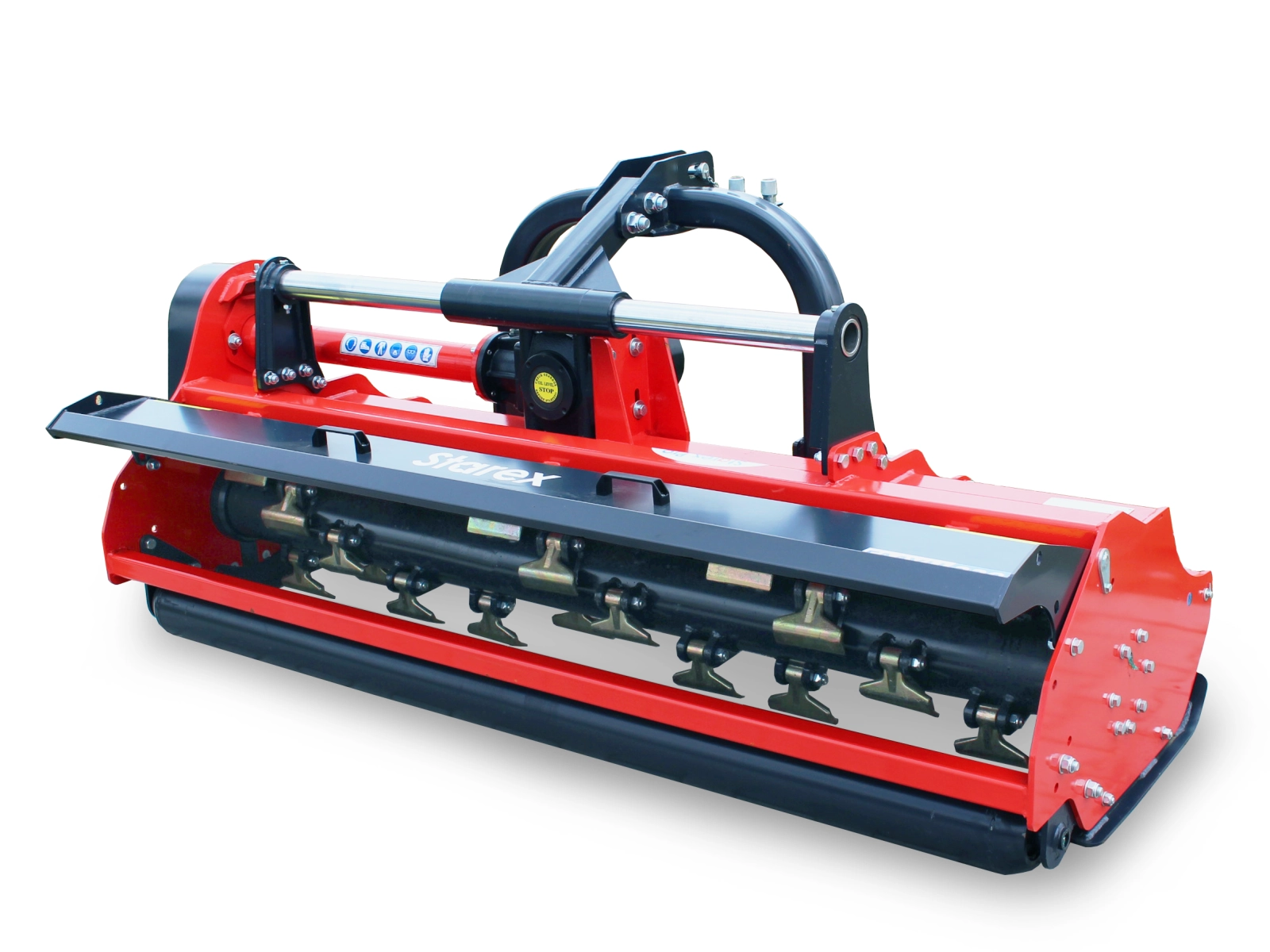 A STAREX FMXH 180-200-220-240 kifejezetten robusztus szárzúzók nyitható burkolattal, hidraulikus oldalmozgatással 50-100 LE traktorokhoz. Az azonnal szembetűnő, 1 cm oldalfal vastagságú, masszív ház nagy átmérőjű, dinamikusan kiegyensúlyozott rotort takar spirális elrendezésű 1.200 gr súlyú zúzókalapácsokkal. A nyitható házburkolat, a 600 mm hidraulikus oldalmozgatás, illetve az 5 db ékszíjjal történő oldallehajtás mind a szárzúzó átlagon felüli képességeit sugallja.
