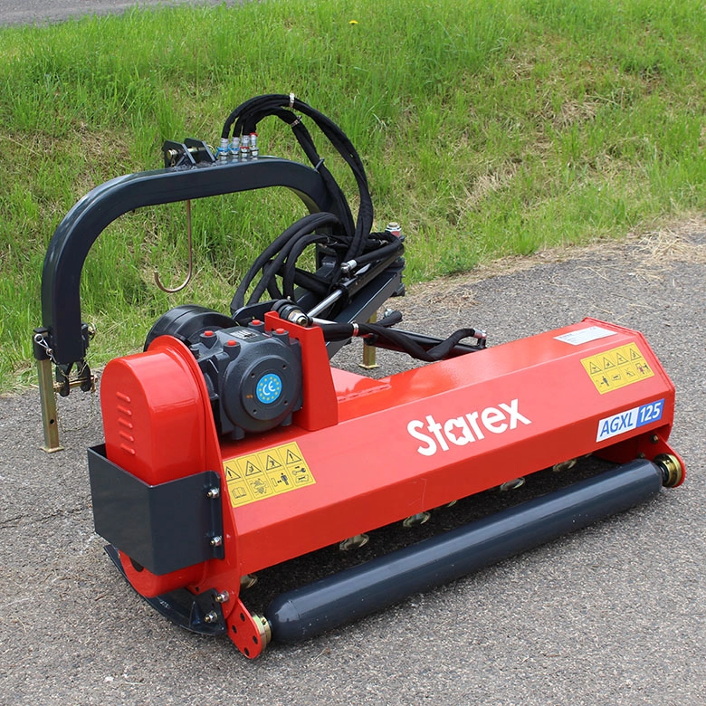 STAREX AGXL 105-125-145-165 rézsű vágására alkalmas hidraulikus oldalmozgatással és dőlésszög állítással rendelkező szárzúzó mulcsozó. Az alapfelszereltség már tartalmazza az igényes kivitelű zúzókalapácsokat (igény esetén Y-késekkel is szerelhető). Hátsó függesztésű, kardántengely meghajtású. Ideális munkagép árokpartok, útpadkák, gyomos, gazos területek, gyümölcsösök tisztítására és bokrok, sövények vágására 20-50 LE teljesítményű traktorokhoz.
