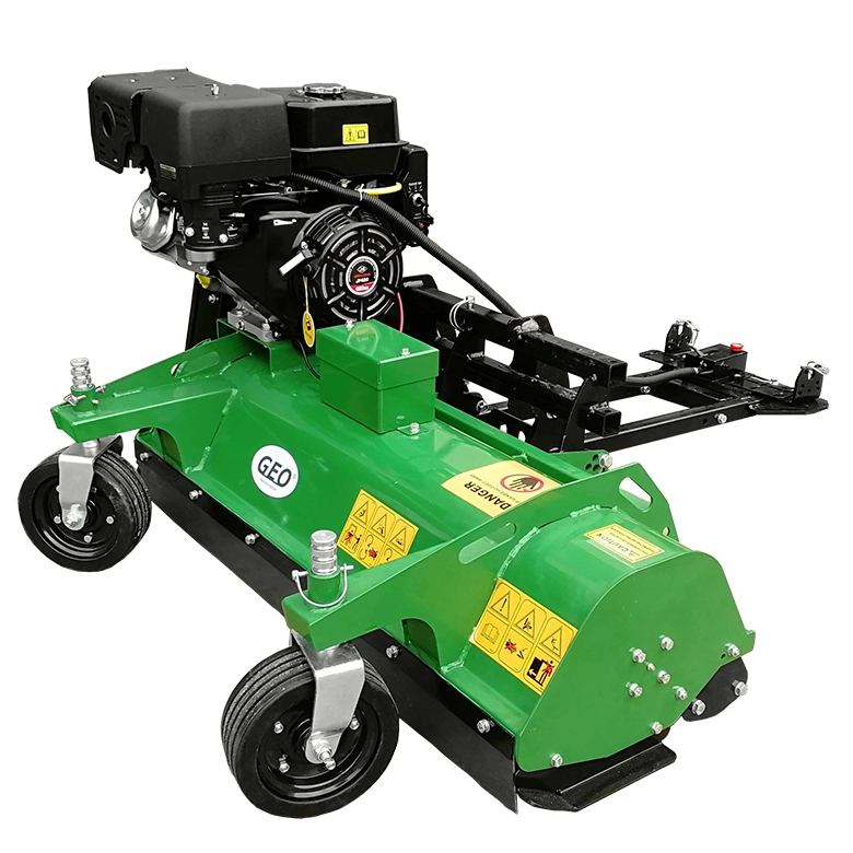 Előre szerelehető GEO ATV F100 Vízszintes tengelyű, lengő Y-késes szárzúzó - mulcsozó - fűnyíró gép quadokhoz, ATV-khez. Saját, négyütemű benzinmotorja 15 lóerős, mely elektromos önindítóval van szerelve. Állítható vágási és kerék magasság.