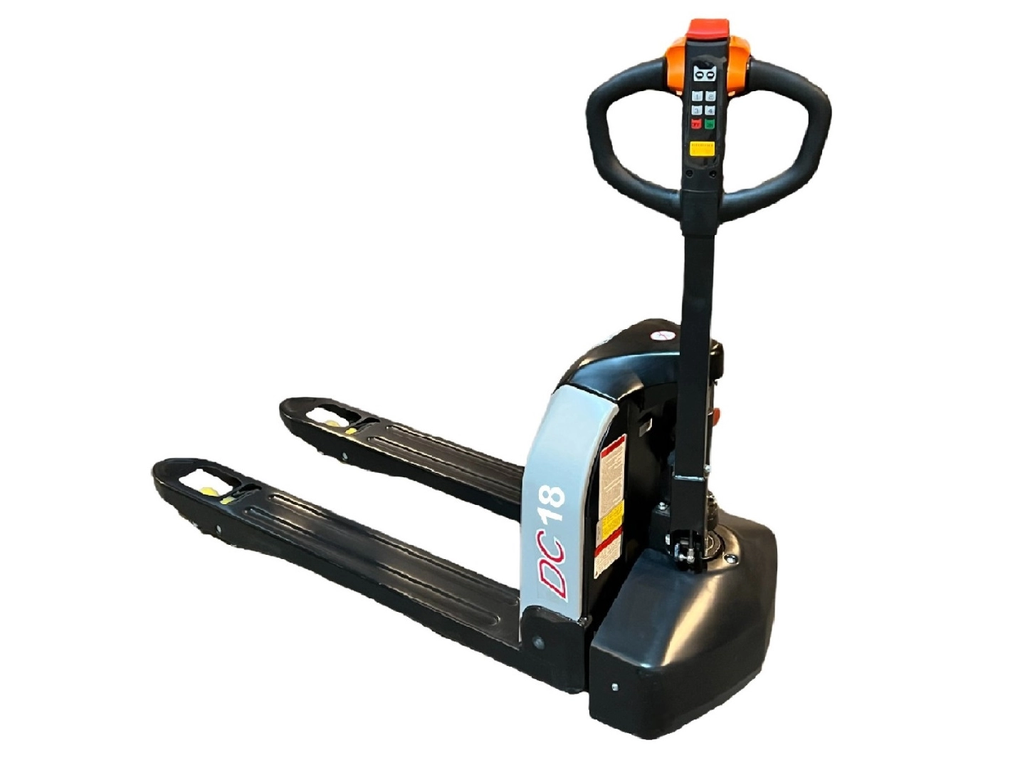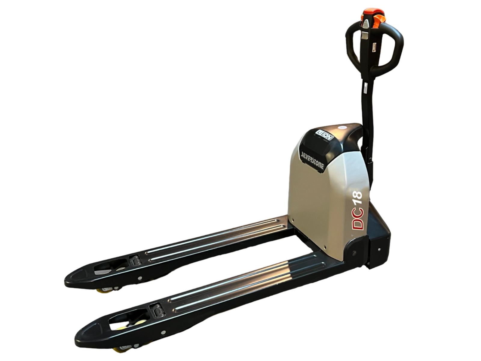 A SILVERSTONE DC 18 - 20 kompakt és gyors elektromos raklapemelő targonca, elektromos emeléssel és kézi süllyesztési funkcióval.